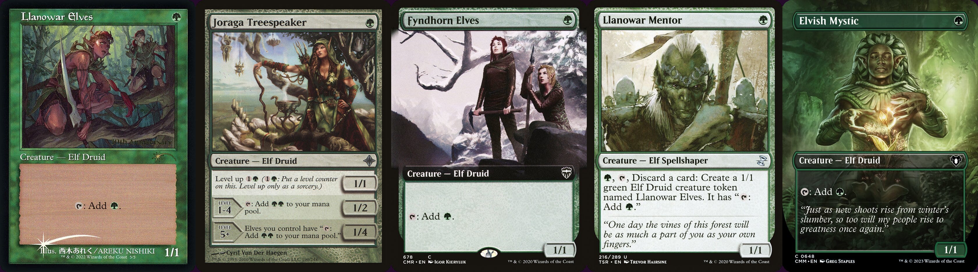 Firstly, there's Fyndhorn Elves, first released in Ice Age before waiting (more or less) until Commander Legends for a reprint. It is another Llanowar Elves with the name plate filed off. We’re not at eight anymore, make that Llanowar Twelves.