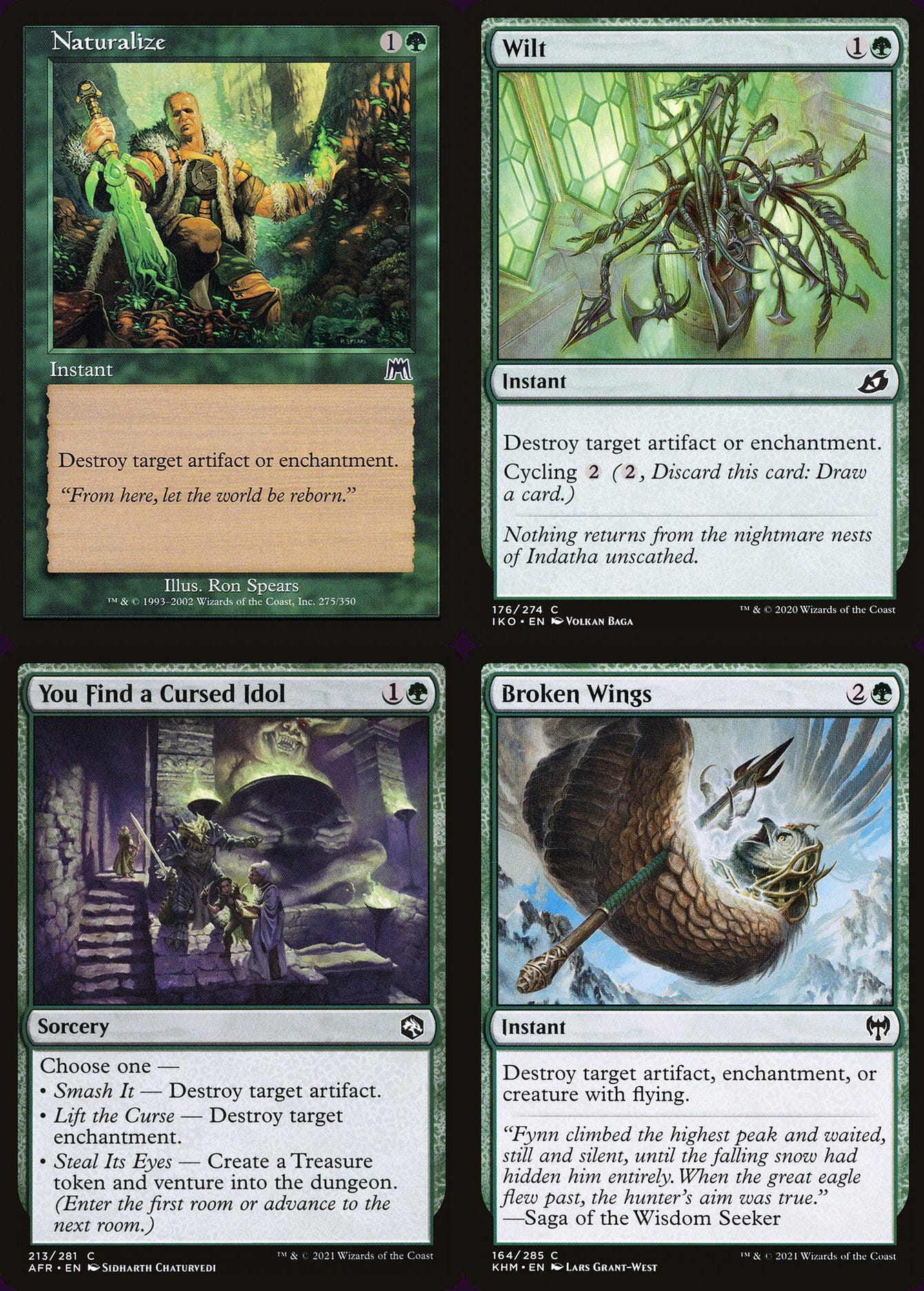 All four of these cards can do the job of “get rid of that artifact/enchantment before it ends the game on me". The three subsequent cards all add something that the original doesn't have. If you felt that you needed, say, six Naturalizes in your 60-card deck, then you could put in two each of Wilt and You Find a Cursed Idol, then take these Broken Wings for good measure.